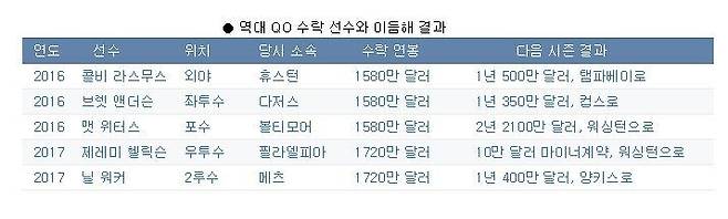 처음 QO를 수용한 사례가 라스무스였다. 2015년 11월의 일이다. 같은 시기에 OK 사인을 낸 선수는 두 명이 더 있다. 볼티모어 포수 맷 위터스, 다저스의 좌완 투수인 브렛 앤더슨이었다.