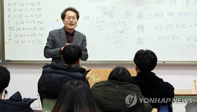 (서울=연합뉴스) 현장밀착형으로 일주일간 서울 관악구 인헌고등학교를 방문 중인 조희연 서울시교육감이 28일 오후 1학년 4반 학생들과 종례시간을 갖고 있다. 2018.11.28 [서울시교육청 제공]