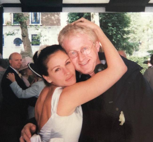 줄리아 로버츠는 21일(한국 시각) 자신의 SNS에 1999년 개봉한 영화 '노팅 힐' 마지막 웨딩 촬영신 사진을 공개했다. 사진에서 줄리아 로버츠는 웨딩드레스를 입고 저스틴 커티스 감독과 다정하게 포즈를 취하고 있다.