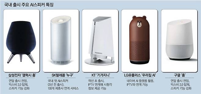 스트래티지애널리틱스에 따르면 지난 2분기 글로벌 시장에서 구글 홈의 점유율은 27.6%로 아마존 알렉사(41%)에 이어 2위를 기록했다. 글로벌 2위 AI스피커인 구글 홈의 등장에 따라 SK텔레콤·KT·LG유플러스 등 이동통신 3사가 주도하던 경쟁이 더욱 치열해질 전망이다. 여기에 삼성전자는 연말이나 내년 초 자사의 AI비서 플랫폼 빅스비 2.0을 탑재한 갤럭시 홈을 내놓을 것으로 보인다. 갤럭시 홈은 특히 하만의 AKG스피커 6개와 우퍼 등을 넣어 경쟁 제품에 비해 음질을 높였고, 마이크를 8개 넣어 멀리 있는 이용자의 목소리도 인식할 수 있는 게 특징이다. 또 TV·냉장고 등 삼성의 가전제품과도 연계될 것으로 보인다.