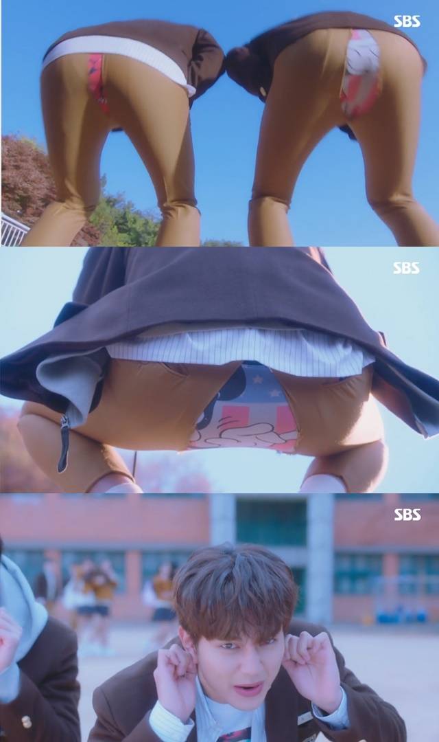 강복수와 이경현은 담임 박선생(천호진 분)에게 들켜 오리걸음 체벌을 받았다. 강복수와 이경현이 쭈그려 앉자마자 바지가 찢어졌다. 그 상태에서 두 사람의 팬티가 그대로 보여 방송에 재미를 더했다. 이때 강복수를 짝사랑하는 양민지(박아인 분)가 강복수에게 “사랑해”라고 고백했고, 강복수는 “사랑합니다 누님”이라고 맞받아쳤다. 박선생은 그런 강복수에게 오리걸음 5바퀴를 추가로 지시하며 시청자에 웃음을 안겼다. (사진=SBS ‘복수가 돌아왔다’ 캡처)