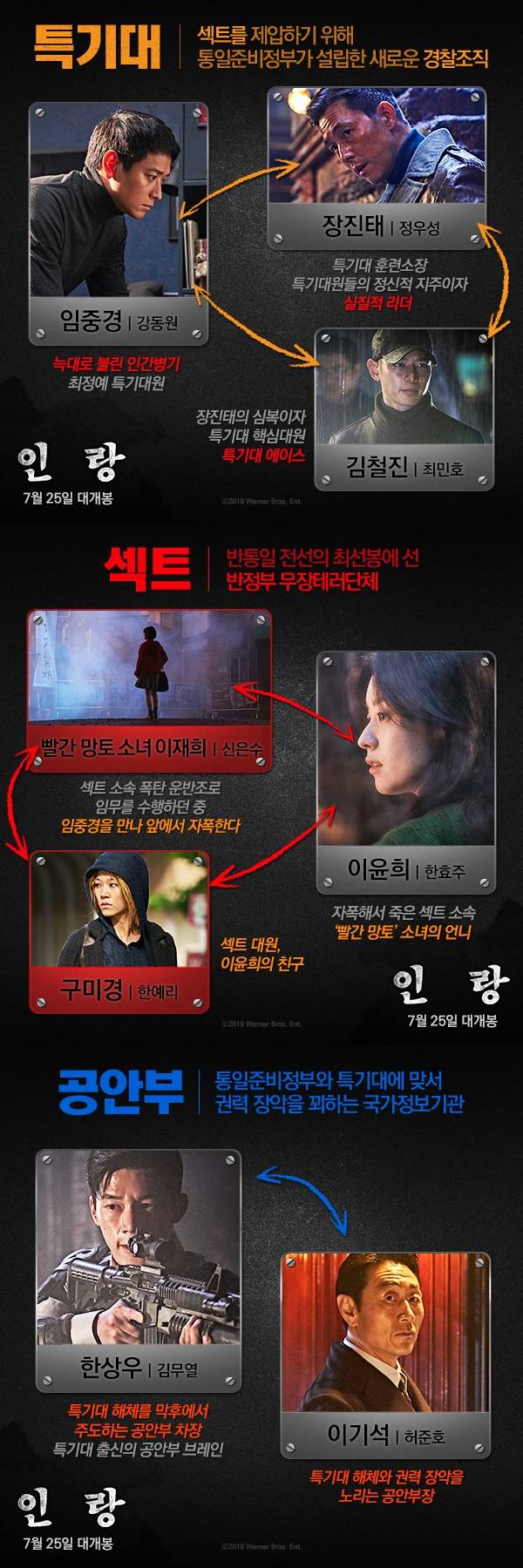 특기대를 끊임 없이 경계하고 위협하는 공안부의 카리스마 넘치는 인물들도 눈길을 끈다. 특기대 해체를 막후에서 주도하는 공안부 차장 ‘한상우’(김무열)과 특기대의 해체는 물론, 권력 장악을 노리는 공안부장 ‘이기석’(허준호)은 냉혈한 권력형 인물의 표본을 보여주며 극의 긴장감을 더할 예정이다. 꽉 짜인 스토리와 각각의 개성을 지닌 캐릭터들의 앙상블로 영화의 완성도를 더욱 높일 ’인랑’의 인물 관계도는 영화에 대한 관객들의 궁금증을 더욱 높이고 있다. 7월 25일 개봉.