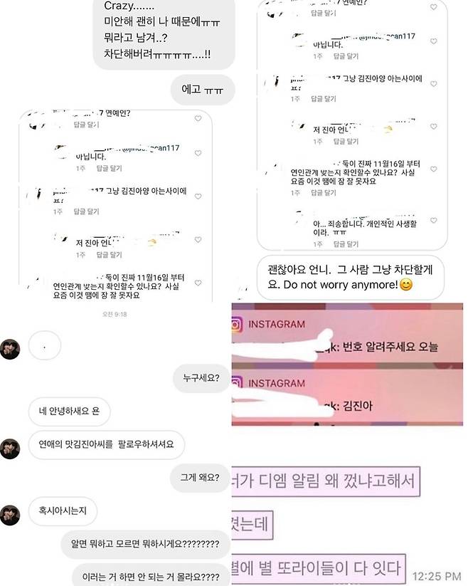 김진아가 함께 올린 사진 속에는 그녀의 지인들에게 연락한 DM 내용이 담겼다. 이들은 별다른 설명도 없이 ‘김진아와 아는 사이냐’, ‘방송 내용을 알려줄 수 있냐’, ‘김진아 번호 알려달라’ 등의 질문을 던졌고, 그녀의 지인들은 당황스러운 마음을 감추지 못했다.