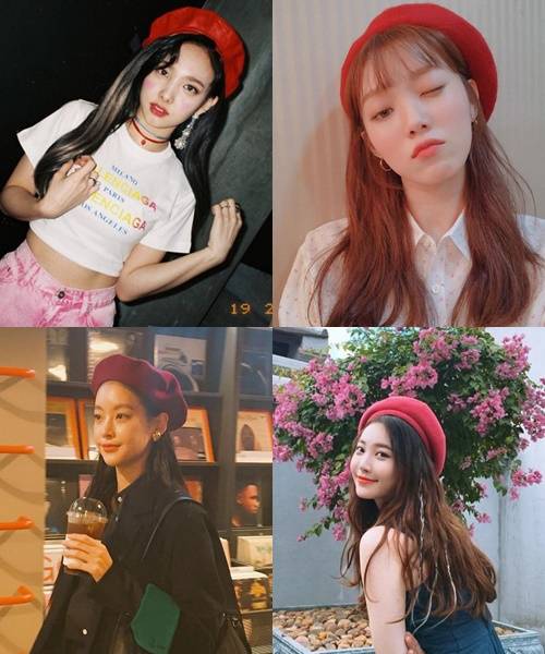 레드벨벳 예리는 블랙 니트와 타탄 체크 톱에 빨간 베레모로 상큼함을 더했다. 여기에 늘어지는 곡선형의 골드 이어링으로 포인트를 줬다. 배우 오연서 역시 골드링에 빨간 베레모로 상큼발랄한 느낌을 연출했다. 모델 겸 배우 이성경은 블라우스에 섞인 레드 패턴과 어우러지는 빨간 베레모로 돋보이는 미모를 완성했다. 걸스데이 유라는 민소매 원피스와 함께 매치해 상큼한 매력을 과시하며 특유의 밝은 에너지를 뽐냈다. 트와이스 나연도 스웨이드 소재의 레드 베레모를 멋지게 소화하며 통통 튀는 매력을 발산했다.