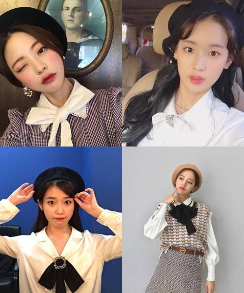 배우 박환희는 화이트 색상에 가슴에 커다란 푸시 보우(pussy bow·블라우스나 드레스 목둘레에 묶어 연출하는 리본)가 달린 의상을 입고 블랙 베레모를 썼다. 특히 긴 모발과 앞머리에 자연스러운 웨이브를 넣어 귀여운 느낌을 줬다. 가수 아이유는 주얼리가 박힌 리본 블라우스에 심플한 블랙 베레모로 사랑스러운 분위기를 더했다. 모델 임보라는 흰 리본이 포인트인 퍼플 체크 블라우스와 블랙 베레모에 진주 이어링으로 빈티지한 무드를 살렸다. 걸스데이 혜리가 선택한 베레모의 컬러는 카멜. 비슷한 톤의 니트 베스트, 리본 화이트 블라우스, 스커트로 사랑스럽게 연출했다.