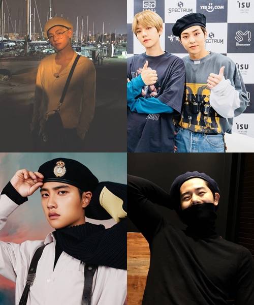 남자 스타도 예외는 아니다. 특히 엑소 시우민과 방탄소년단 뷔는 유독 베레모 스타일링을 자주 선보여 눈길을 끈다. 청바지에 박시한 회색 스웨트 셔츠를 입은 시우민은 앞머리를 올리고 블랙 베레모로 포인트를 줘 귀여운 캐주얼룩을 완성했다. 뷔는 화이트 티와 화이트 셔츠에 남색 베레모로 포인트를 줘 풋풋한 소년미를 자아냈다. 가수 겸 배우로 활동 중인 김동준은 자칫 밋밋할 수 있는 검은색 목폴라에 남색 베레모로 포인트를 줘 시크하면서도 소년스러운 매력을 뽐냈다. 반면 엑소 디오는 흰 셔츠에 서스펜더, 마치 공군 모자를 연상시키는 배지가 달린 베레모로 시크한 카리스마를 내뿜어 눈길을 끌었다.