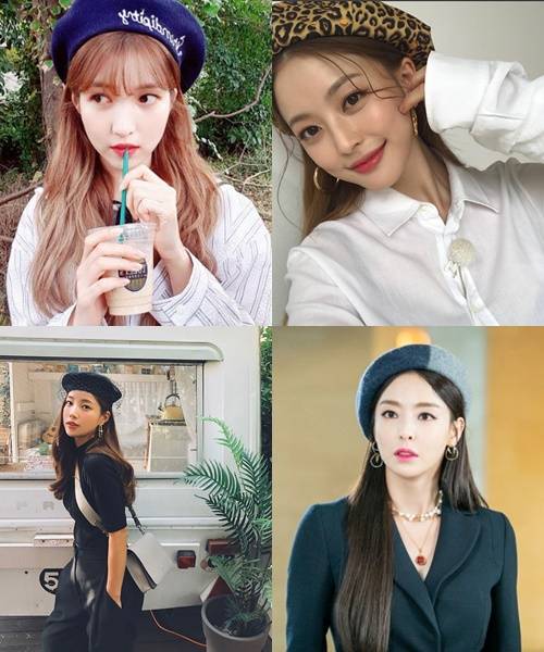 패턴이 들어갔거나 장식이 달린 베레모는 화려하고 유니크한 느낌으로 스타일링할 수 있다. 최근 트렌드로 자리 잡고 있는 '레터링 베레모'는 스타들의 잇 아이템 중 하나다. 오연서는 블랙 컬러의 레터링 베레모로 차분하면서도 사랑스러운 느낌을, 여자친구 소원은 파란 베레모에 화이트 레터링으로 상큼한 미모를 과시했다.