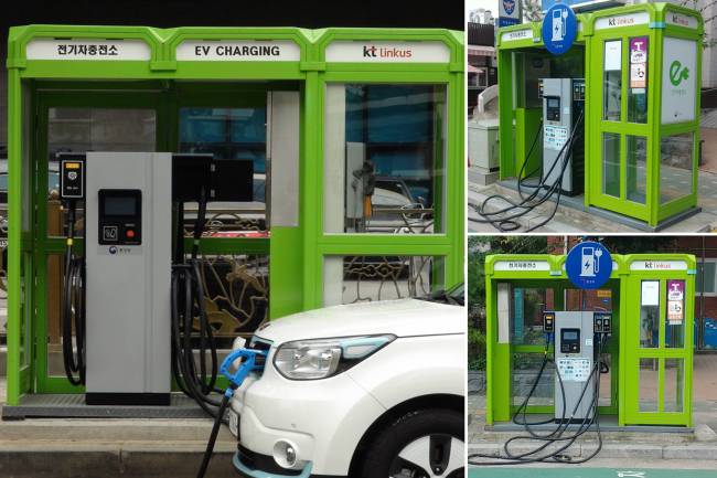 도로에 서서 전화하란 의미일 리는 없다. 나머지 두 칸 안을 살펴봤다. 부스 안에 전기차 충전소가 설치돼 있었다. 앞바닥에도 초록색이 칠해져 있고 ‘EV 전기자동차’라고 적어 놨다.