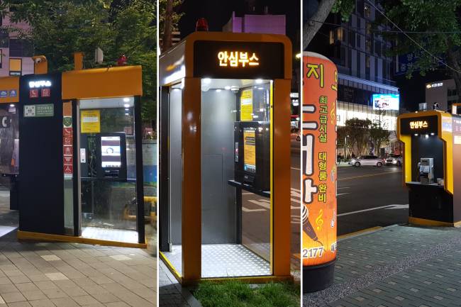 안심부스를 본 대학생 정세미(23) 씨의 답이다. 보통 공중전화 박스는 하늘색인데 안심부스는 노란색ㆍ회색으로 돼 있다. 안심부스는 괴한이 쫓아올 때 급히 문을 닫고 경찰이 도착할 때까지 버틸 공간을 마련해주는 것. 쓰임새가 줄어든 공중전화 부스를 재활용했다.
