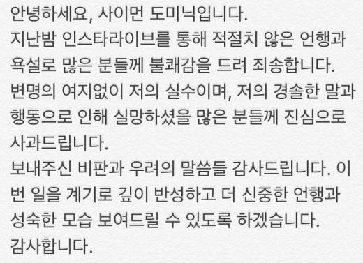 가수 쌈디(사이먼 도미닉)가 욕설 논란에 결국 사과했다.