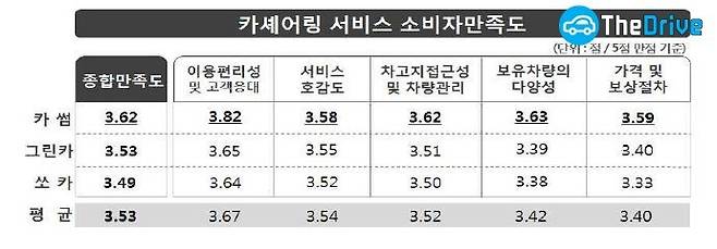 조사 결과 소비자 만족도는 평균 3.53점(5점 만점 기준)으로 집계됐다. 카썸·그린카·쏘카 순으로 만족도가 높았고 피해 구제 합의율은 그린카가 쏘카에 비해 상대적으로 높게 나타났다.
