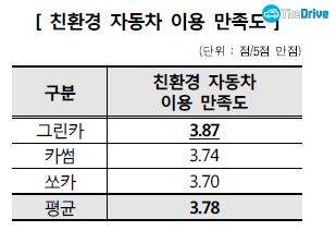 응답자 중 41.4%(300명)는 전기차 또는 하이브리드차(이하 '친환경 자동차')를 이용한 경험이 있다고 대답했다. 이용자들의 만족도는 평균 3.78점이었으며, 업체별로는 그린카가 3.87점으로 가장 높았고 이어 카썸(3.74점), 쏘카(3.70점) 순이었다.