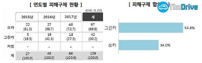 최근 3년간(2015년~2017년) 한국소비자원에 접수된 3개 카셰어링 서비스 업체 관련 피해 구제 신청은 총 139건이다. 업체별로는 쏘카가 69.8%(97건)로 가장 많았고, 그린카가 30.2%(42건)인 것으로 나타났다. 피해구제 합의율은 그린카(54.8%)가 쏘카(34.0%)에 비해 상대적으로 높게 나타났다.