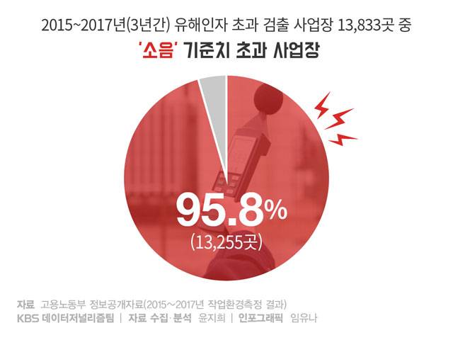 공개된 자료에 의하면 지난 3년동안 소음 기준을 초과한 사업장 13,833곳 가운데 10.8%인 1,431곳에서 기준보다 4배나 많은 소음, 즉 '100dB ~ 105dB'의 소음이 측정됐습니다. 또한 115dB 이상, 즉 기준치보다 32배가 넘는 소음이 측정된 사업장도 16곳이나 됐습니다. 무엇보다 심각한 것은 이것이 순간 소음 측정값이 아니라 8시간 지속적으로 이 정도의 소음이 측정됐다는 것입니다.(한 사업장 중복 측정시 가장 높은 측정값 적용)