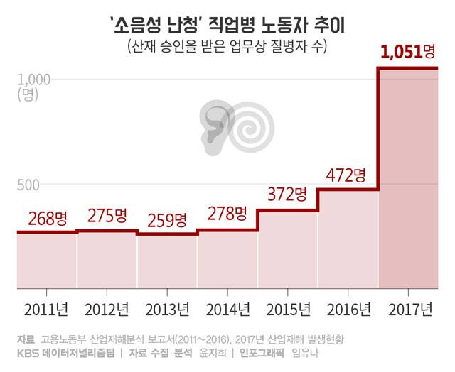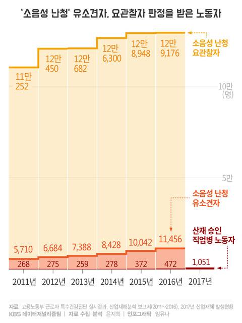 실제 우리나라의 경우도 특수건강진단을 통해 소음에 의한 '소음성 난청' 직업병 소견을 받은 노동자(유소견자)는 2015년에 이미 만 명을 넘어섰습니다. 더구나 향후 지속적인 관찰이 필요한 '소음성 난청' 요관찰자로 분류된 노동자는 2016년 기준 13만 명에 육박합니다.
