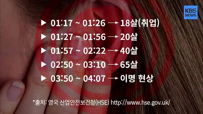 아래 음성 파일은 청력 손실을 가져올 수 있는 소음에 매일(하루 8시간) 노출됐을 경우 세월이 흐르면서 청력이 얼마나 손실되는지를 느낄 수 있도록 영국 산업안전보건청(HSE)이 제공하는 시연용 음성 파일입니다. 18살(동영상 1분17초쯤)에 정상적인 청력을 지녔을 당시 들리던 소리가, 소음에 노출된 일터에서 계속 일할 경우 점점 어떻게 변하는지 느껴보시기 바랍니다.(처음에 볼륨을 가능한한 크게 높인 상태에서 동영상을 시작해야 마지막에 얼마나 청력이 손실되는지를 느낄 수 있습니다.)