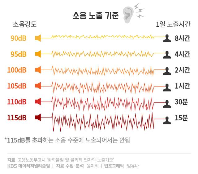 우리 기준은 8시간 90dB이지만, 전문가들은 보통 85dB 이상의 소음을 지속적으로 들을 경우 소음성 난청이 발생할 위험이 높다고 합니다. 이 경우 특수건강진단 대상이 됩니다. 또 앞서 설명한 것처럼 소음 측정값이 100dB이면 기준치(90dB)의 4배나 되는 소음에 노동자가 노출돼 있는 것입니다. 115dB로 측정된 경우는 기준보다 32배나 많은 소음에 노출된 것입니다.