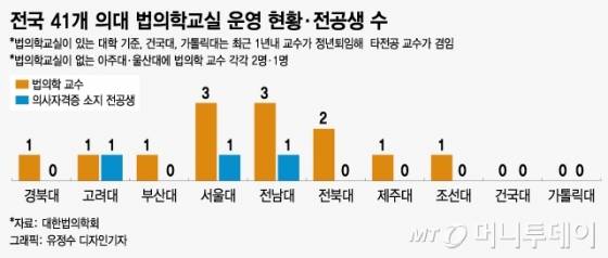 법의학 전공자들의 진로는 크게 두 가지다. 국립과학수사연구원(국과수) 법의관이 되거나 법의학 교수가 되는 길이다. 교수가 될 수 있는 자리도 많지 않다. 전국 41개 의대 중 법의학 교실이 있는 곳은 10곳, 법의학 교수는 16명에 불과하다. 그마저도 가톨릭대와 건국대는 최근 유일한 법의학 교수가 은퇴하면서 병리학 교수가 겸임하는 방식으로 명맥만 이어가고 있다.