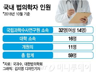 대한법의학회와 국립과학수사연구원에 따르면 전국 법의학자는 올해 10월 기준 총 59명이다. 국과수 소속 법의관 32명과 대학 소속 법의학자 16명, 개원의 11명이다. 치아로 연령 추정이나 개인식별을 하는 치법의학자도 6명이 있다.