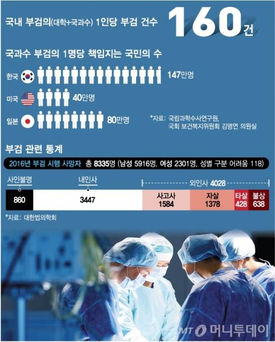 부검의들은 근무량이 많은 가운데 정확한 검시를 위해 고군분투한다. 2016년 기준 우리나라 65세 이상 원인불명 사망률은 10.1%, 65세 미만은 5.2% 수준으로 세계보건기구(WHO) 권고율(각각 10%, 5%)을 겨우 맞추고 있다.