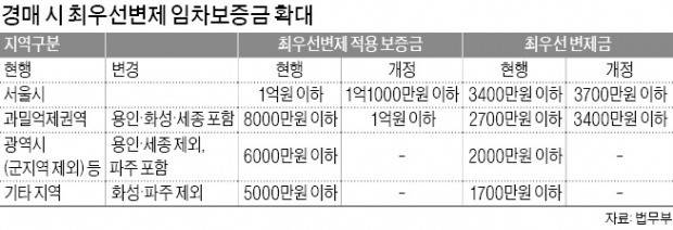 수도권 과밀억제권역 등에선 최우선변제 적용 보증금이 기존 8000만원 이하에서 1억원 이하로 바뀌었다.