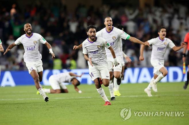 (알 아인[아랍에미리트] EPA=연합뉴스) 알 아인(아랍에미리트) 선수들이 18일(현지시간) 아랍에미리트 알 아인에서 열린 리버 플레이트(아르헨티나)와의 2018 국제축구연맹(FIFA) 클럽월드컵 준결승전에서 승리한 뒤 기뻐하고 있다. 알 아인은 이날 리버 플레이트와 2-2로 승부를 가리지 못해 이어진 승부차기에서 5-4로 이겼다.