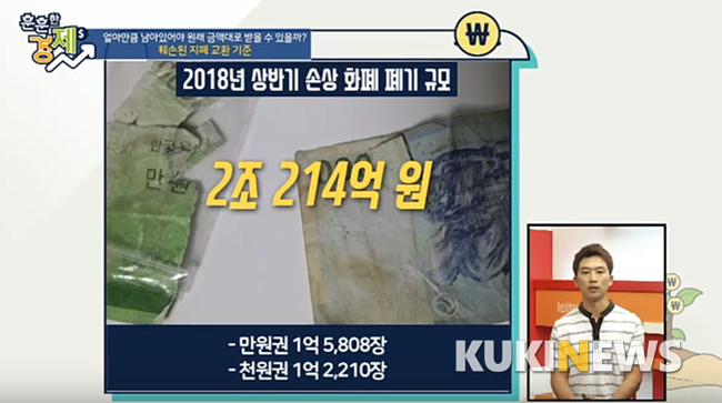 김민희 아나운서 ▶ 쉽고 재미있는 경제 정보가 함께 하는 훈훈한 경제. 오늘도 쿠키뉴스 송금종 기자 나와 있습니다. 안녕하세요. 송금종 기자 ▷ 안녕하세요. 송금종 기자입니다. 김민희 아나운서 ▶ 네. 송금종 기자, 오늘은 어떤 정보 전해주실 건가요? 송금종 기자 ▷ 올해 상반기에만 폐기된 손상 화폐 규모가 2조214억 원에 달하는 것으로 드러났습니다. 이를 새 화폐로 만드는데 드는 비용 또한 324억 원에 수준인 것으로 나타났는데요. 만약 지폐가 훼손된다면 어떻게 해야 할까 고민해본 적 있으시죠. 그래서 오늘은 훼손된 지폐 교환 기준에 대해 알아봅니다.