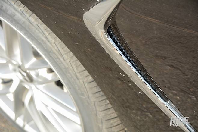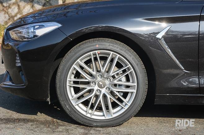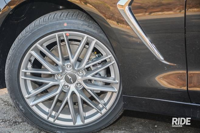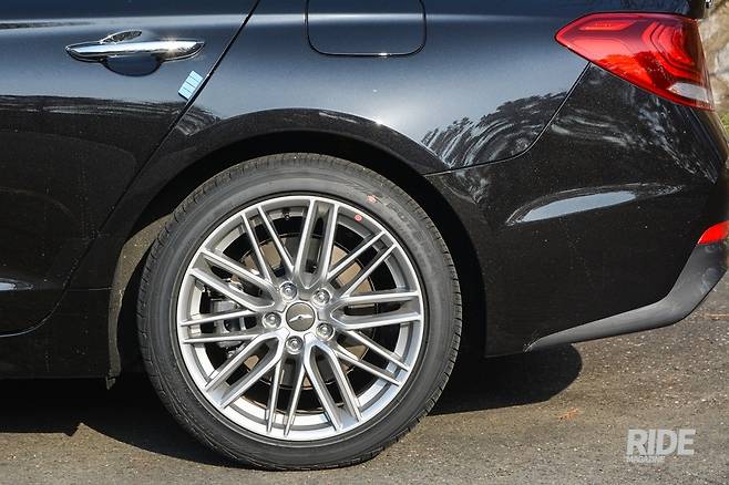루프 라인은 최근 유행하는 스포츠백이나 쿠페 라인 대신, 4도어 세단의 부드러운 라인을 썼다. 어느것 하나 극단으로 치닫지 않고, 조화롭게 배치되어있다. 휠은 18인치에 앞뒤로 브릿지스톤 225/45R18 포텐자 RE97AS-02타이어가 장착되었다. 차급에 비하면 상당히 빈약한 너비의 타이어지만, 승차감과 연비를 감안한 선택이다. 또 네바퀴 굴림방식이기 때문에 구동력에 있어서는 부족함이 덜할 것이다. 하지만 후륜구동이라면 19인치 225/40R19, 255/35R19 미쉐린 썸머타이어를 선택하는 것이 직진 안정감 있고 높은 출력을 뒷받침 해줄 것 같다.