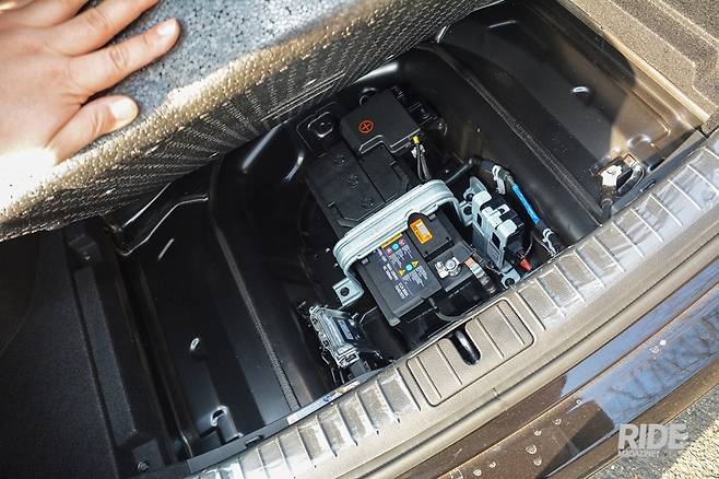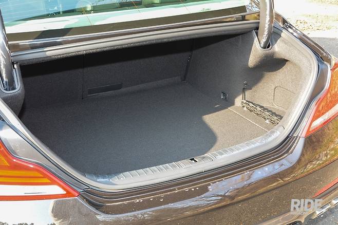 트렁크는 스마트 전동식 트렁크가 적용됐다. 용량은 495리터이며 높이는 낮지만 생각보다 안쪽으로 깊게 들어간다. 6:4 폴딩도 가능해 긴 물건을 싣는데는 큰 무리가 없다. 덮개를 들쳐보면 아래에는 오토 스톱 스타트로 시동이 자주 꺼졌다 켜지는데 특화된 AGM 배터리가 있다. 공간 활용도 면에서는 아쉽지만, 무게배분에 있어서 뒤쪽에 배터리를 놓으면 무척 효율적이기 때문에 고성능 차량에서 많이 볼 수 있다. 현대차에 있어서는 무척 비효율적인 선택인데, 어디까지나 스포츠 세단인 G70이기에 허용되는 것이다.