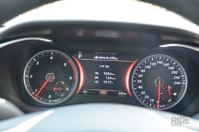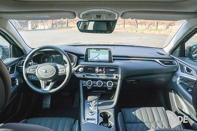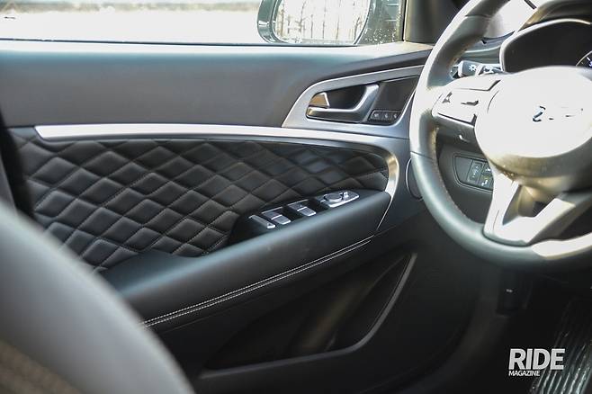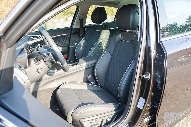 도어는 금속으로 장식된 레버 주변 외에도 바느질로 무늬를 낸 가죽이 둘러싸고 있다. 필러부터 천정까지는 전부 부드러운 기모와 비슷한 천 재질로 되어있다. 팰리세이드에서 봤던 그 재질이다. 1열 시트는 무척 낮다. 바닥과의 차이가 거의 나지않는 점은 이 차량의 성격―스포츠 세단―을 결정짓는 요소다. 평소 타던 차량에 앉으니, 이건 뭐 거의 트럭처럼 느껴진다. 시트는 코너에서도 몸을 꽉 고정시켜준다. 시트 측면 볼스터는 스포츠모드와 연동해서 조여줄 수 있는 기능이 적용되었다. 고급 고성능 차량들에 종종 적용되는 기능이다. 1열 조수석 옆에는 2열 승객을 위해 시트를 앞, 뒤, 경사도를 조절할 수 있는 워크 인 디바이스 스위치가 장착되어있다.