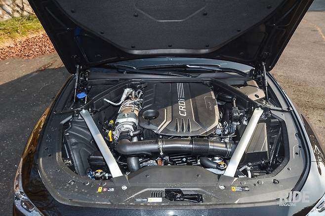 G70는 가솔린 3.3 V6 트윈터보, 2.0 터보와 디젤 2.2 R e-vgt 엔진을 라인업으로 갖췄다. 시승차 G70 2.2D HTRAC 모델은 최대출력 202마력(3,800RPM), 최대토크 45.0kgfm(1,750-2,750)를 발휘한다. 직렬 4기통 2.2 R엔진은 그랜저, 기아 K7, 카니발, 쏘렌토 R, 맥스크루즈, 스팅어 등에 적용되었던 것을 후륜구동용으로 세로배치 한 것이다. 엔진은 상당히 안쪽으로 배치되어 있어 무게 배분에 신경을 썼다. 8단 변속기와 HTRAC 상시 사륜구동시스템이 맞물려 복합연비는 13.5km/l를 발휘한다. 2.2 R엔진은 낮은 회전수에서도 힘있게 차를 밀지만, 본격적으로 힘을 내는 구간은 2,000RPM 아래 부근부터이다. 묵직한 토크는 차체를 여유롭게 가속시킨다. 유로6C 기준을 만족하는 2.2 R엔진은 요소수를 사용해 배기가스를 정화한다.