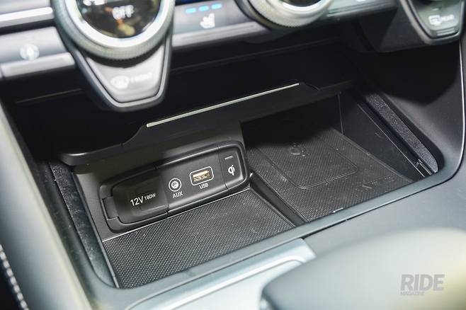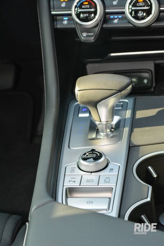 변속레버는 전자식 변속레버가 적용되었다. 파킹-후진-중립-드라이브를 거치지 않고 바로 파킹상태에 놓거나 버튼을 누르고 조작해 출발 또는 후진할 수 있다. 변속레버 아래쪽엔 드라이브 모드 셀렉트 다이얼이 있다. 한 번에 한 가지씩만 옮길 수 있도록 되어있고, 모드는 스마트-에코-컴포트-스포츠-커스텀이 있다. 그 옆으로는 자주 사용할 것 같은 구동력 제어/차체 제어 OFF 스위치, 후방 센서, 카메라 제어 스위치, 오토홀드 스위치와 오토 스톱 스타트 OFF 버튼이 있다. 공조기 아래쪽에는 USB포트와 무선충전 패드가 자리 잡았다. 슬라이딩 도어를 통해 사용하지 않을 때는 닫을 수 있는데, 닫히는 느낌이 무척 부드럽다. 유격이 거의 없어서 고급스러운 느낌이다.