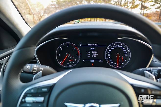 드라이브 모드는 컴포트가 기본이다. 3.3T에는 전자식 가변댐핑 시스템이 있어 코너에서 서스펜션이 더 단단해지지만 다른 모델은 적용되지 않았다. 달라지는 것은 스로틀의 반응성, 스티어링 휠의 무게감, 그리고 앞뒤 바퀴의 구동력 배분이다. 드라이브 컴포트에선 스티어링 휠이 거칠 것 없이 가볍게 움직인다. 아주 무게감이 없는 정도는 아니지만, 쉽게 돌아나가서 힘이 거의 들어가지 않는다. 과도하게 전동어시스트가 돌아가서 휙휙 멋대로 돈다기 보다는 돌릴 만큼만 충분히 스티어 돌리는 힘을 보조하는 것 같다. 드라이브 모드 컴포트에서 G70는 네바퀴를 굴리면서 움직인다. 움직임 자체는 무척 안정적이다. 컴포트에서는 50:50 배분을 기반으로, 각 네바퀴의 회전수가 달라질 경우 각각 다르게 구동력을 분배한다.