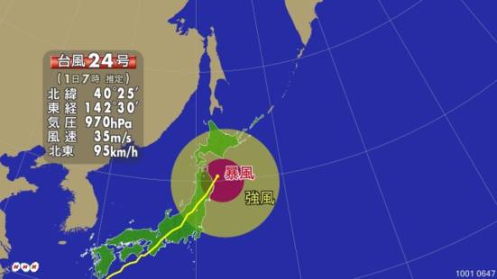 일본 기상청은 강풍으로 폭풍과 해일, 토사 재해 우려가 있다고 예보했다. 1일부터 2일 오전까지 24시간 강수량은 홋카이도에서 100mm, 일본 동북지역에서 80mm에 이를 것으로 전망된다.