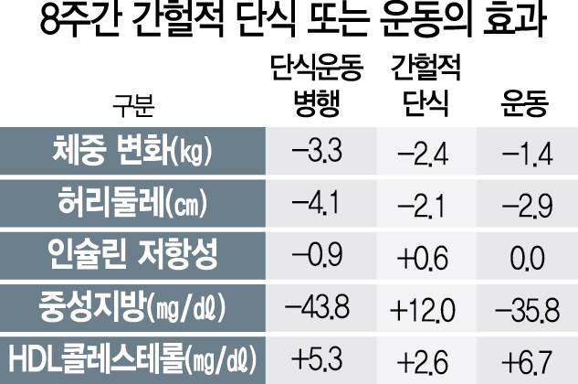 운동은 주 3회, 회당 60분씩 근력운동(40분)과 유산소운동인 에어로빅(20분)을 병행했다. 운동 전후 5분씩 트레드밀을 걷는 준비·정리 운동 시간은 운동 시간에 포함하지 않았다. 그 결과 8주 후의 체중 감량 성적은 단식·운동 병행군이 평균 3.3㎏로 단식군 2.4㎏, 운동군 1.4㎏을 웃돌았다. 복부비만을 나타내는 허리둘레 감소 성적은 단식·운동 병행군 4.1㎝, 운동군 2.9㎝, 단식군 2.1㎝의 순이었다. 근육량 손실은 단식을 하지 않고 운동만 한 군에서 가장 적었다.