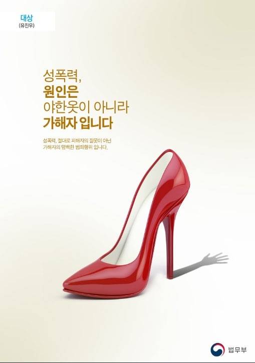 | ▲ 2017년 법무부 주최로 열린 '성폭력 근절 포스터 공모'에서 당선작. 문구로 "성폭력, 원인은 야한 옷이 아니라 가해자입니다"라고 썼다. |