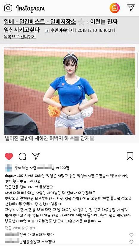 지난 10일, 스포츠계 치어리더들의 성희롱 폭로가 나왔다. 시작은 프로야구 삼성 라이온즈에서 활동하는 치어리더 황다건의 SNS 글이었다. 황다건은 자신의 SNS에 '일베(일간 베스트 저장소, 극우 성향의 커뮤니티 사이트)' 게시글을 갈무리해 올리면서 "치어리더라는 직업은 재밌고 좋은 직업이지만 그만큼의 대가가 이런 건가"라고 썼다. 그는 이어 "댓글창은 진짜 더러워 못 보겠고 (중략) 성적으로 성희롱이든 뭐든 너무 심한 것 같은데"라고 토로하기도 했다.
