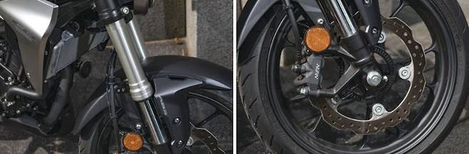 전륜에 사용된 니신의 296mm 싱글 디스크 브레이크가 장착되며 관성측정 장치 IMU 기반의 ABS 시스템이 적용됐다. 다만 ABS의 개입은 다소 빠른 편이였다. 프런트의 ABS는 풀 브레이킹 시 빨리 개입했지만 반발력은 강하게 느껴지지 않았다. ABS가 작동하고 있으니 안심해라고 말하는 정도의 느낌이었다. 하지만 리어 ABS는 한계가 한참 남았을 것 같은데 미리 개입하는 느낌이 유쾌하지는 않았다.