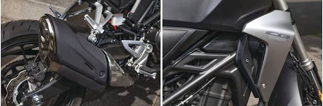 처음 CB300R을 봤을 땐 너무나 콤팩트한 사이즈와 패밀리룩 디자인 탓에 CB125R이라고 착각했다. 많은 부분을 공유하고 있는 125와 300은 차이점을 찾기 어려울 만큼 닮아있다. 꼼꼼히 살펴보면 페어링의 디자인이나 곳곳의 디테일이 다르다. 확실한 구분법은 머플러다. 머플러가 하단에 숨겨진 125와 달리 300은 배기량 탓인지 오른쪽에 커다란 머플러가 달려있다.