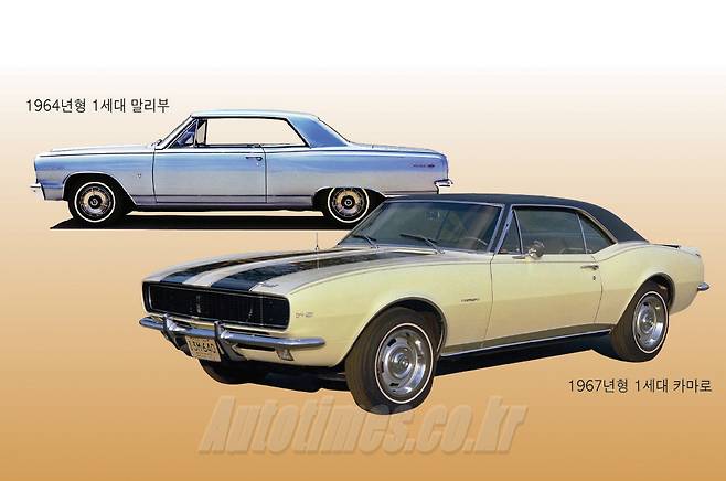 14일 쉐보레에 따르면 말리부는 1964년, 카마로는 1967년에 처음 등장했다. 당시 쉐보레의 주 무대였던 미국은 근육질의 대형 차체와 대배기량 엔진을 탑재한 머슬카 열풍에 휩싸였다. 이에 따라 두 차 모두 고성능 동력계와 후륜구동 시스템, 쿠페 차체를 갖추며 흐름을 따랐다. 말리부는 중형 세단 쉐빌의 최상위 트림으로 출시, 프리미엄 세단으로 시작했다. 그 중 말리부SS는 최고 300마력의 V8 5.4ℓ 엔진을 탑재해 고성능 스포츠카로 인정받기도 했다. 말리부가 지금의 앞바퀴굴림세단으로 변모한 건1997년 5세대에 들어서다. 이후 글로벌 플랫폼을 채택한 쉐보레의 대표 중형 세단으로 자리매김했다.