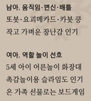 온 가족이 즐기는 선물로는 보드게임 선호도가 높다. 퀴즈 방송 프로그램이 늘어나고 방탈출 카페 등이 인기를 얻어 11번가에서 보드게임 품목 거래액은 지난해 대비 40% 이상 늘었다. 프랑스 국민 보드게임으로 유명한 '도블 보드게임'은 지난해 대비 거래액이 1800배 이상 급증해 히트 상품 반열에 올랐다.