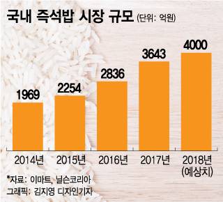 업계 리서치에 따르면 1인당 쌀 소비량이 매년 줄어들고 있는 가운데 냉동밥 및 즉석밥 시장 규모는 매년 두자릿 수 성장을 거듭하고 있다. 국내 즉석밥 시장은 2014년 1969억원 규모에서 올해 4000억원대로 확대될 전망이다. 즉석밥 시장에서 차지하는 냉동밥의 비중 역시 점차 커지고 있다. 2014년에는 약 10%에 불과했지만 2017년 약 20%로 2배 커졌다.