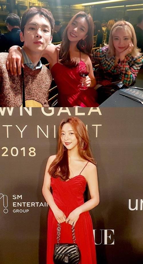 사진 속 루나는 강렬한 레드 컬러의 드레스를 입고 포토월에 서 있다. 환한 미소와 함께 날씬한 몸매가 돋보인다. 단체 사진에서는 와인잔을 들고 키의 어깨에 팔을 둘렀다.