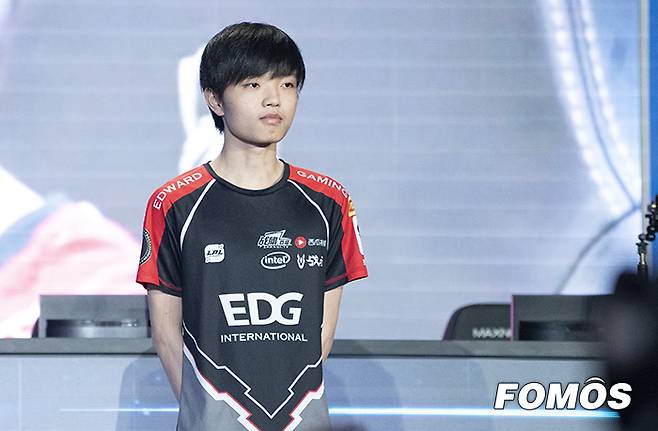 21일 오후 부산 벡스코 오디토리움에서 리그오브레전드 월드 챔피언십(롤드컵) 8강전 프나틱과 EDG의 경기가 열린다. 경기 전 무대 인사를 하는 EDG '아이보이'.