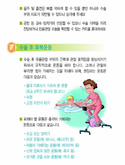 수술 후 무릎관절 부위의 근력과 관절 움직임을 향상시키기 위해서 규칙적으로 운동을 해야하나 관절에 무리한 힘이 가해지는 것은 피해야 한다.