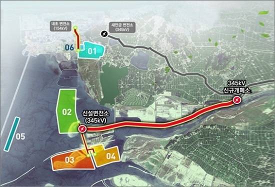 | ▲ 새만금 태양광사업은 새만금 부지 전체의 약 9%인 37㎡면적에 2.8GW 설비용량의 태양광발전소를 만드는 것이다. 이 중 300MW만 육상태양광이고, 나머지는 산업용지로 활용할 수 없는 지대에 수상태양광패널을 설치한다. 지도에서 1~4번에 해당하는 부분이다. |
