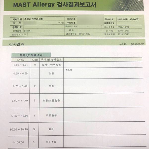 알레르기 검사는 동네 이비인후과에서 쉽게 할 수 있으며 비용은 3~4만 원 정도다. 피를 뽑고 3일 정도를 기다리자 결과가 나왔다.