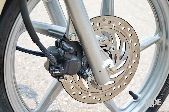 제동 시스템으로는 앞 디스크 브레이크와 1포트 캘리퍼를 물렸다. 뒤는 드럼 브레이크다. 난폭운전이 많은 서울 도심에서 끼어드는 차량을 회피하는 데에도 디스크 브레이크는 매우 유용하게 작동했다. 적은 악력으로도 제동력은 즉각적으로 나왔으며 강력한 리어 드럼브레이크도 함께 쓰면 제동력은 한 단계 강해진다. 자연스럽게 발 끝이 닿는 위치의 리어 풋 브레이크 페달은 작동하기가 매우 쉬웠고 낮은 속도에서 속력 조절하기가 좋았다.