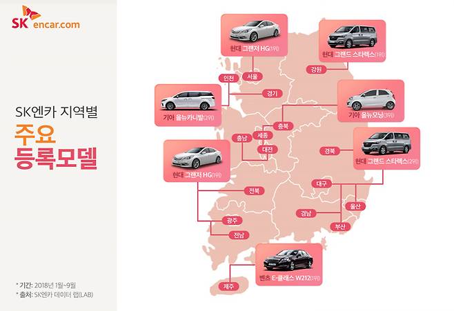 올해 1월부터 9월까지 SK엔카닷컴에 등록된 매물을 전국 각 주요 지역에 따라 집계한 결과다. 시장 판도 변화를 살펴보기 위해 지난해 동일 주제로 실시했던 결과(2017년 1월~10월)와 함께 비교 분석했다.