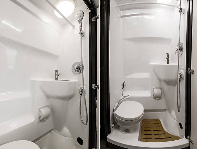 주방 맞은편으로는 화장실이 위치한다. 바이-폴딩 도어라고 이름 붙인 캐비닛 타입의 문은 접을 수 있는 구조를 가지고 있다. 필요에 따라 문을 접어서 사용할 수 있다. 화장실은 고정식 카세트 변기와 세면대로 구성된다.